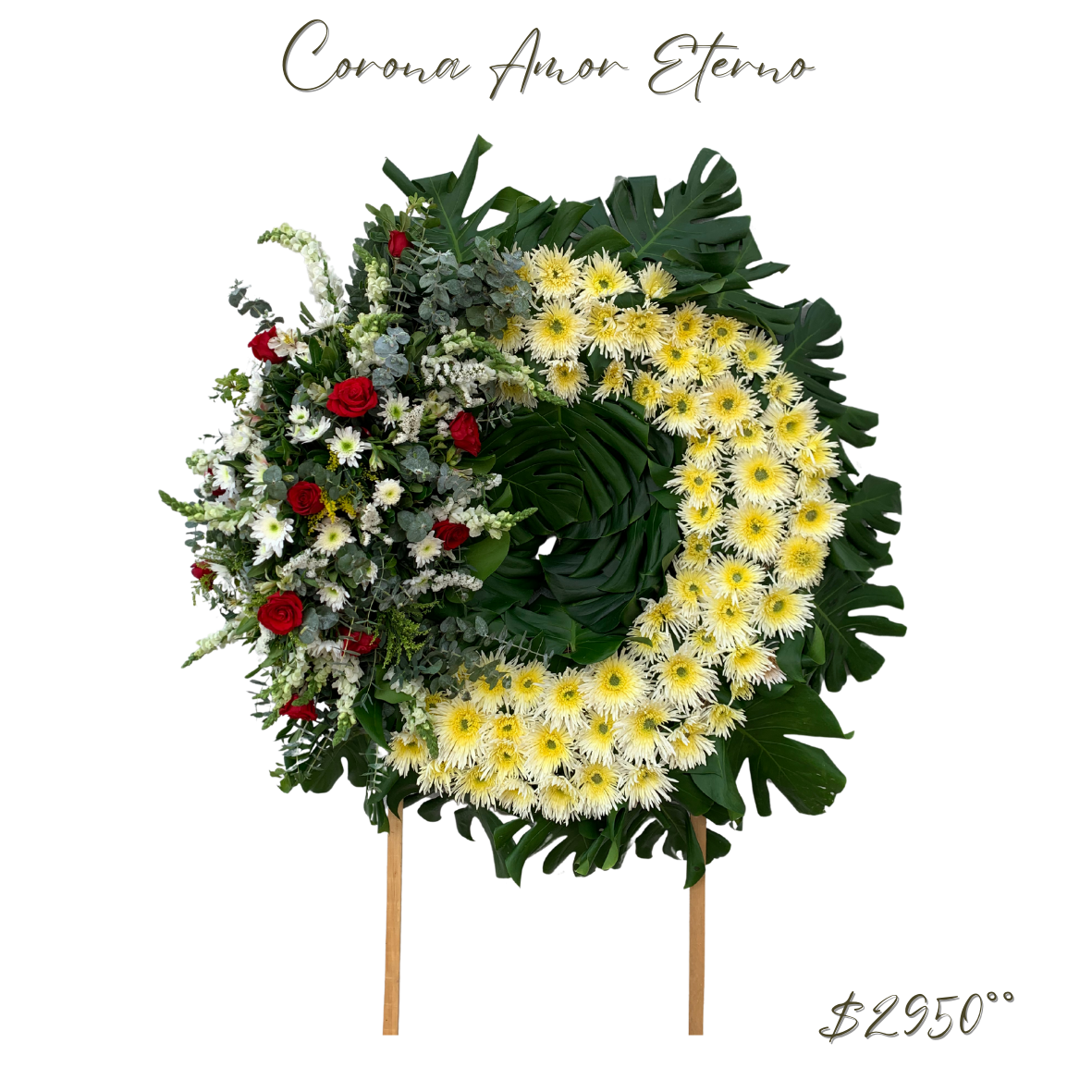 La Corona Amor Eterno 🌹 es una hermosa corona funeraria diseñada para expresar amor eterno y recuerdo. Está compuesta por rosas rojas, lirios, gladiolas y crisantemos, arreglados en forma circular para simbolizar la continuidad y el afecto eterno. La corona tiene una altura aproximada de 1.90 metros y un ancho de 1 metro, lo que la convierte en un homenaje conmovedor. Además, incluye una cinta personalizable para escribir un mensaje significativo 🎗️.