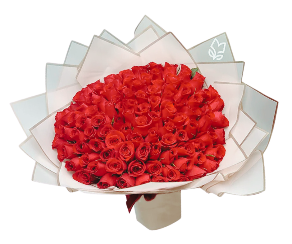 Un impresionante arreglo con 100 rosas rojas frescas. Perfecto para expresar amor y admiración en grande.
