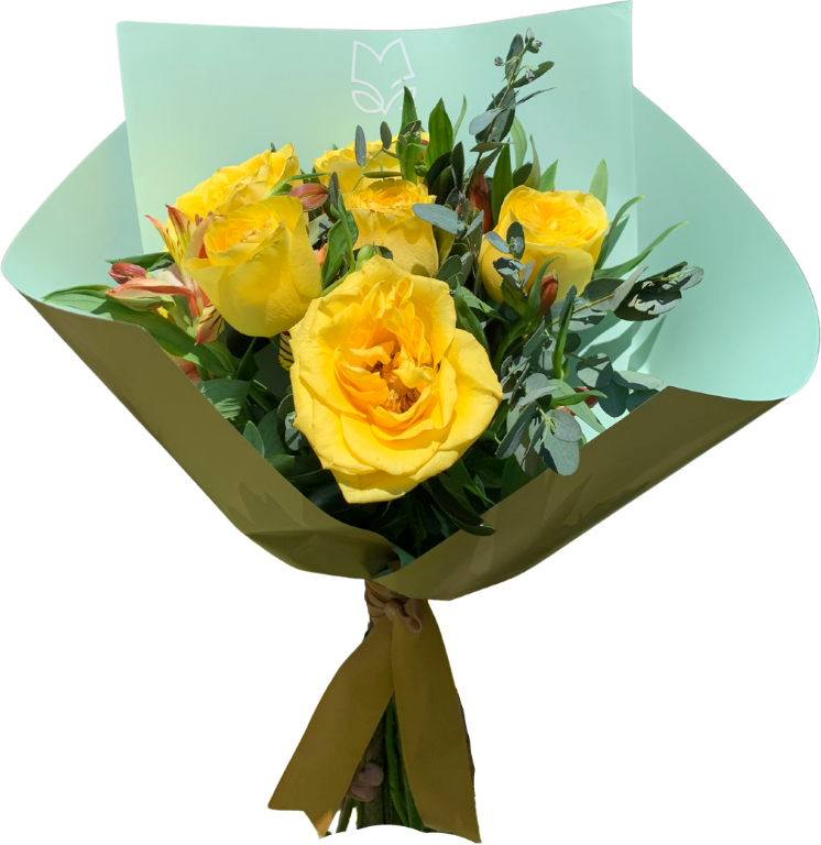 Un ramo vibrante de 6 rosas amarillas y follaje, que simboliza alegría y creatividad, envuelto con delicadeza en papel elegante. Este arreglo es un canto visual a la primavera, lleno de esperanza, belleza y calidez. 🌸✨